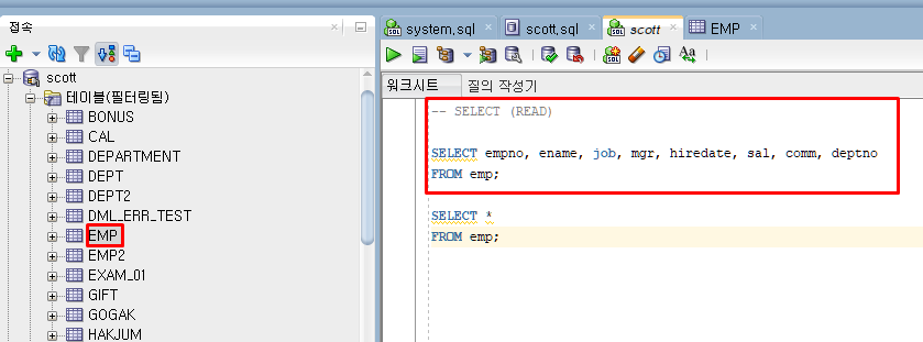SELECT empno, ename, job, mgr, hiredate, sal, comm, deptno