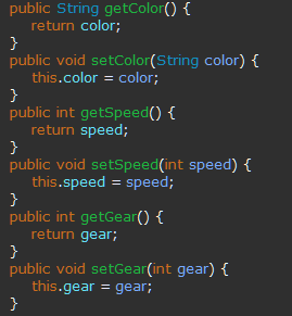 return "Car3 [color=" + color + ", speed=" + speed + ", gear=" + gear + "]";